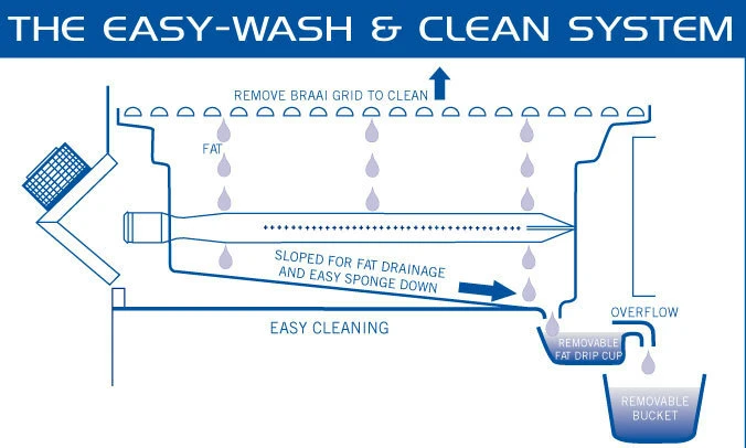 El Sistema de Limpieza Fácil. La suave superficie de la cuba es de acero esmaltado en porcelana, junto con los canales de drenaje, hace que la grasa fluya hasta un recipiente, permitiendo así que la barbacoa sea muy fácil de limpiar. El recipiente recoge grasa está en la parte posterior de la barbacoa y es de muy fácil acceso.