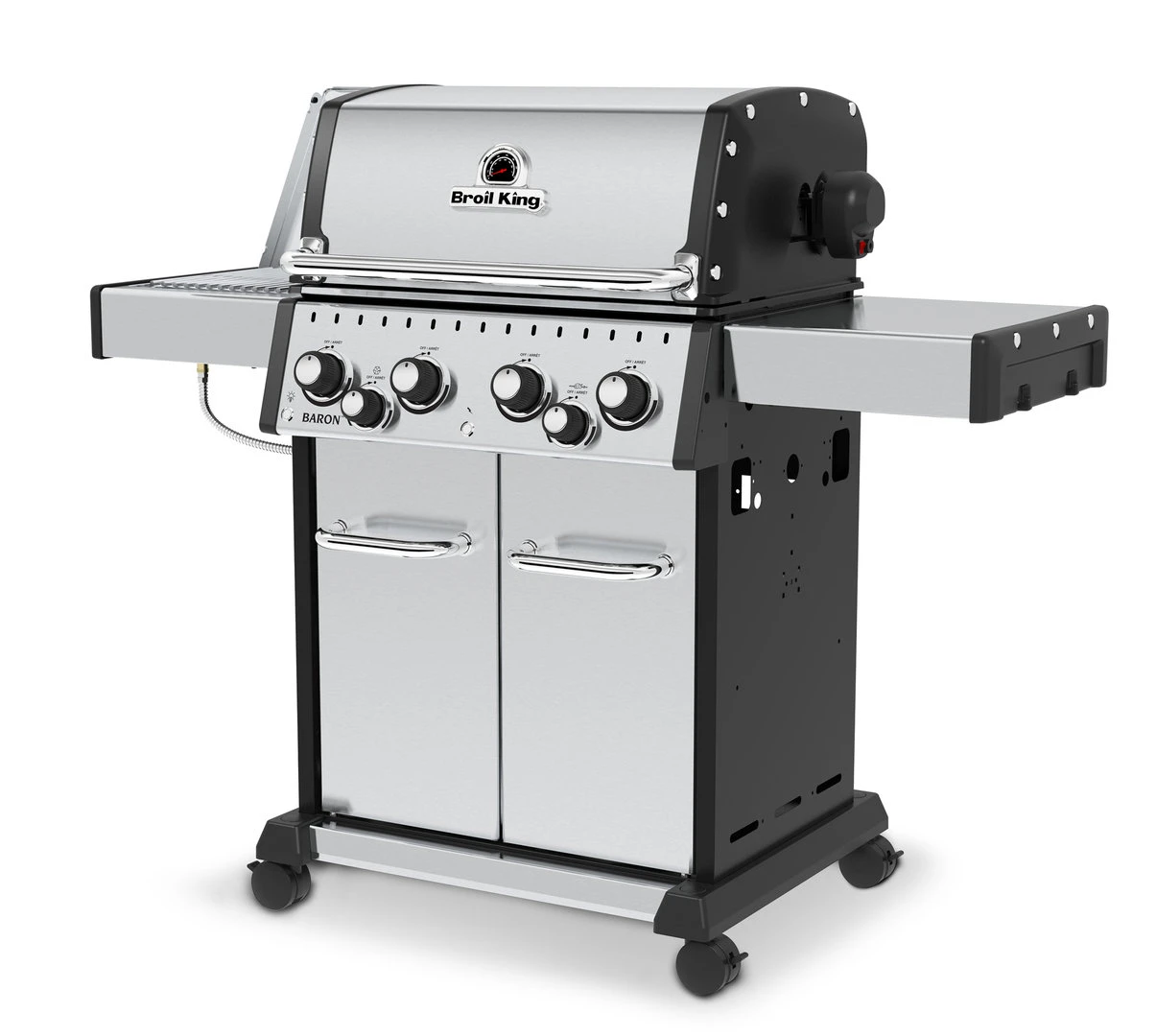 Las barbacoas Broil King de la serie Baron son fabricadas con los mejores materiales, tiene una amplia zona de cocción y son muy potentes satisfaciendo con creces nuestras necesidades. Las robustas parrillas de cocción son de hierro fundido y hacen que retengan el calor con lo que conseguiremos dorar rápidamente nuestros alimentos además son reversibles por un lado son canales huecos v y por el otro son en ^ ideal para dorar y marcar alimentos. Su amplia tapa es perfecta para utilizar nuestra barbacoa como un horno (cocción indirecta) perfecto para asar ternera, pavo, etc. Las barbacoas están construidas con una altísima calidad y con una potencia insuperable.