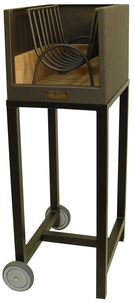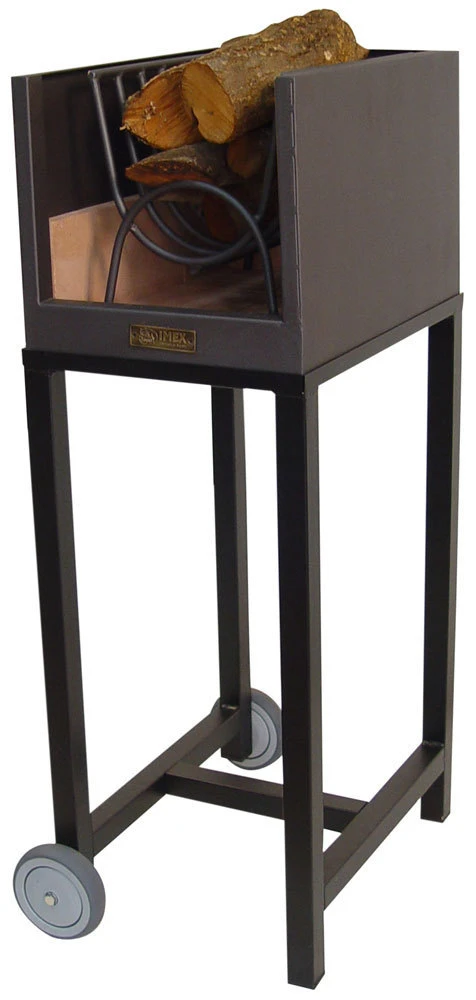 Cajón con carro fabricado en hierro forjado con pintura resistente a 800 ºC, soporte para la leña y base de ladrillo refractario.
