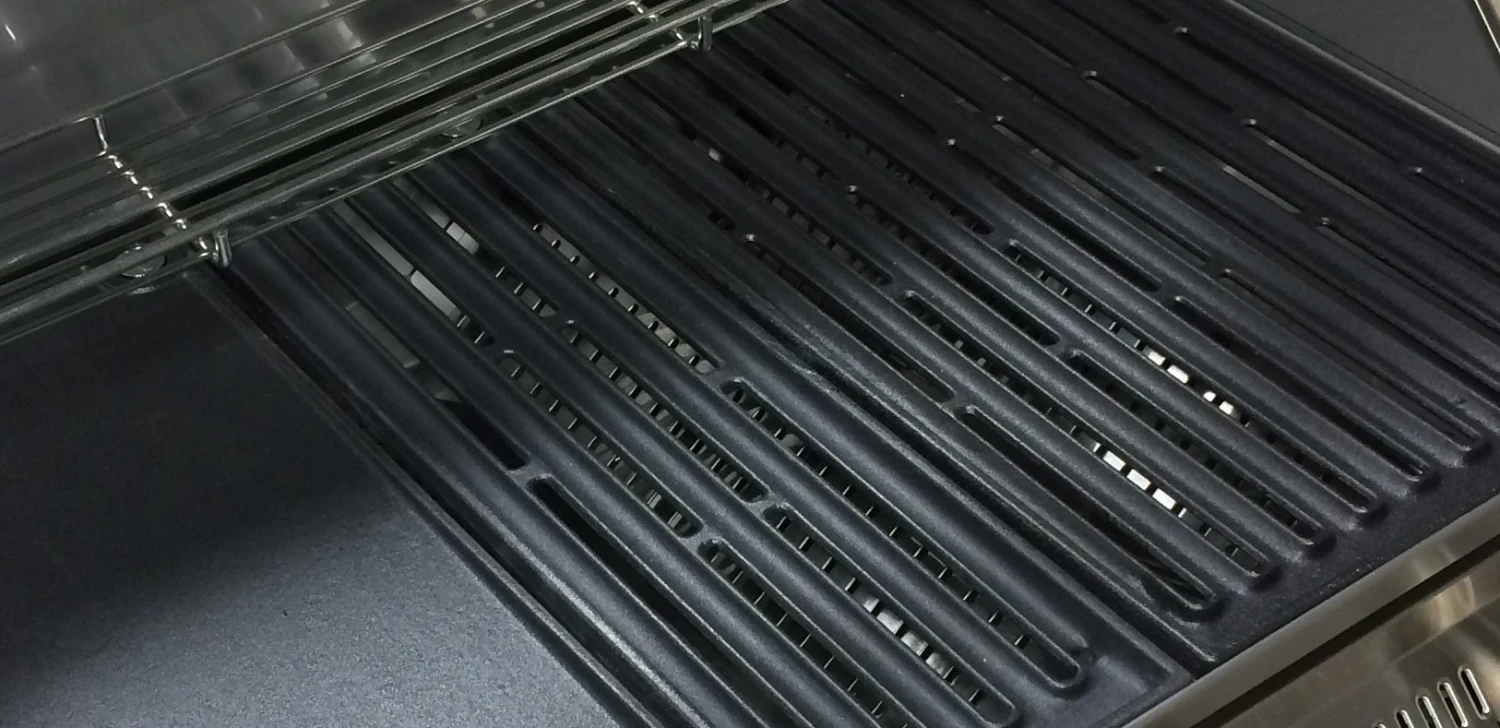 – Zona cocción dispone de 1 plancha reversible de 39 x 48 cm. + 1 parrilla reversible de 39 x 48 cm. de hierro fundido.