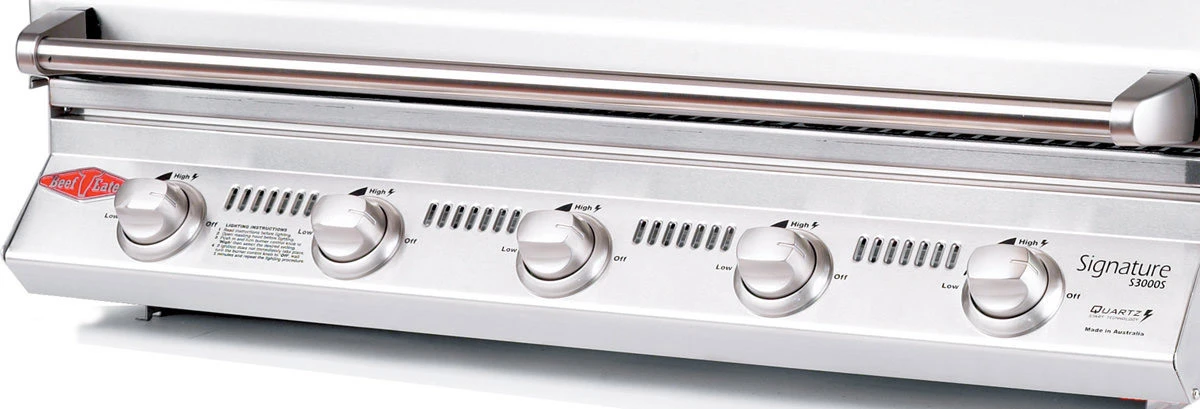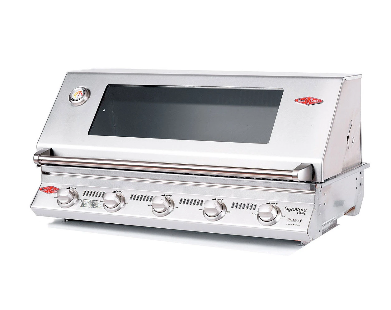 Barbacoa de gas de Acero Inoxidable Beefeater Signature S3000S 5BHF Encastrar con parrillas y plancha de cocción de hierro fundido.