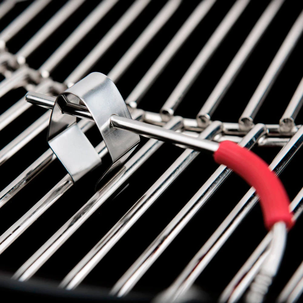 Incluye un clip metálico que se coloca en contacto con la parrilla para dejar la sonda suspendida dentro de su barbacoa y capturar la temperatura interior sin que entre en contacto con la superficie de cocción.