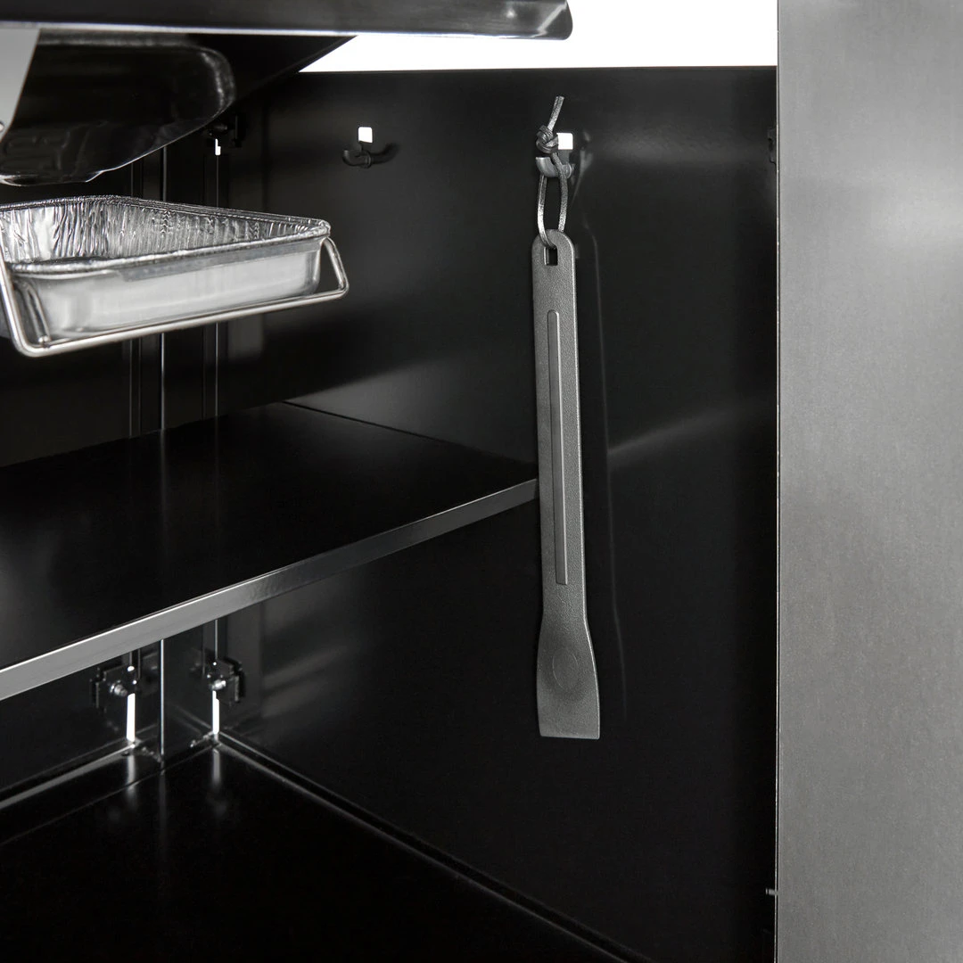 Cuelgue sus espátulas, pinzas, cepillos para parrillas y demás utensilios de barbacoa en los ganchos para utensilios integrados en la barbacoa. Use los ganchos de doble cara situados en el lateral del armario para guardar cómodamente las rejillas de cocción en el exterior de la barbacoa. Unos ganchos adicionales dentro del armario permiten guardar la rejilla separadora Weber Crafted, que puede usarse con los accesorios para barbacoa Weber Crafted Gourmet BBQ System.